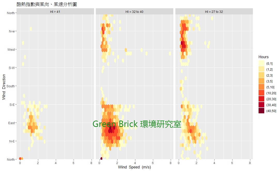 讓我們來看這些設計者錯在哪裡。上圖第四張是某亞熱帶氣候城市的酷熱指數與風向風速進階分析圖,從圖上可以很清楚地發現,酷熱指數除了在靜風之外,在東風轉東偏北風的方向上,第一、二、三級都有出現大量的數據,這是很明顯的夏季盛行風表現沒錯。但是在西風轉西北風的方向上,也出現了許多第一級與第二級的數據。這表示在冬季季風系統初形成一段時間,或是系統衰退前的一段時間,受到氣溫與濕度的影響,導致酷熱指數仍然到達某些等級。若是便宜行事,直接忽略冬季盛行風向的通風策略,將導致環境設計的手段至少有 15% 以上的時間是失敗的。