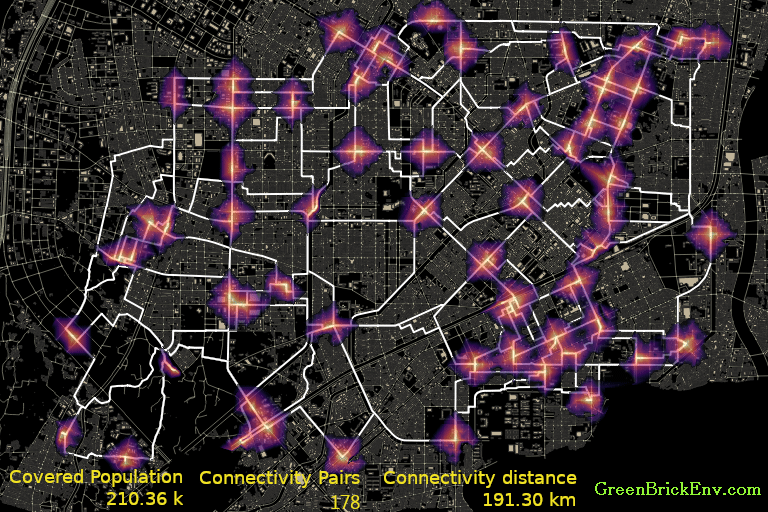 透過人工智慧最佳化演算,我們可以獲得我們尋求的答案。請注意這個案例和我們之前介紹的建築光環境最佳化案例不同,這個例子我們尋求的是覆蓋人口數為高權重的解。